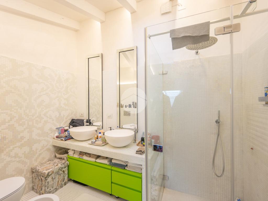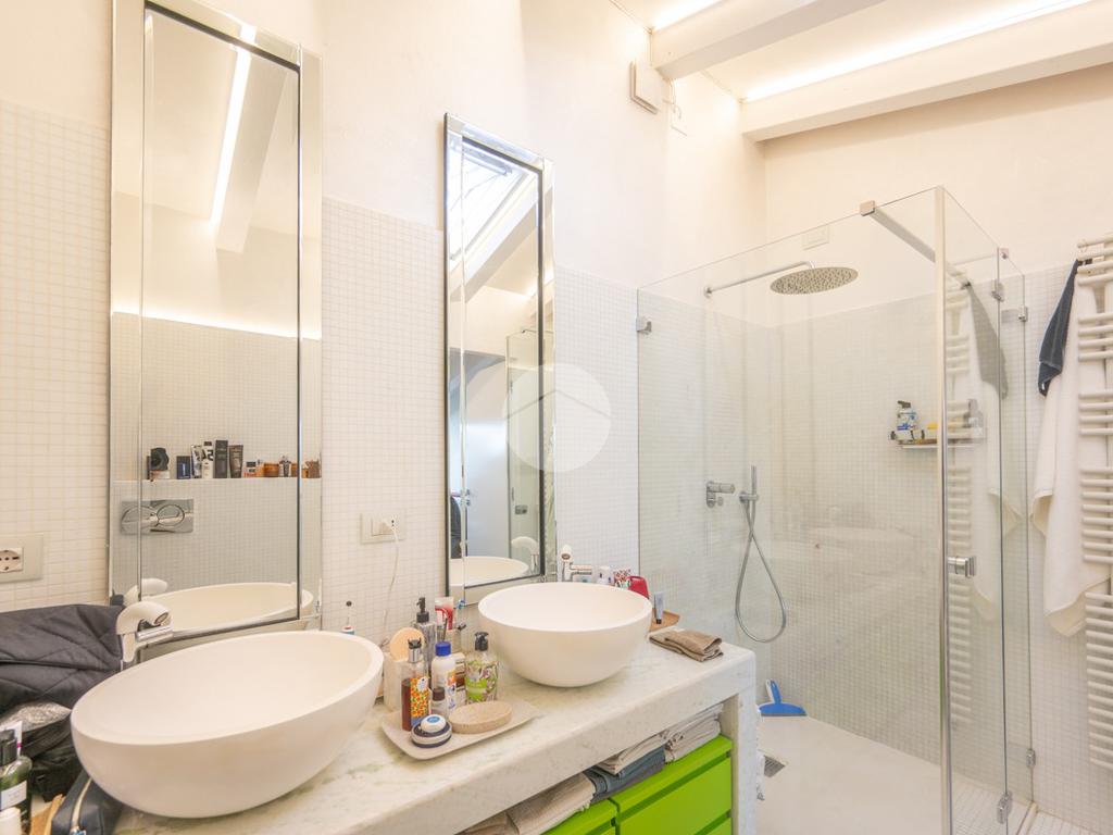 Un punto di eccellenza è il bagno, completamente nuovo di Bisazza, dove spicca un ampio lavabo in resina elegantemente installato su un piano in marmo, in un ambiente rifinito con mosaici a parete.