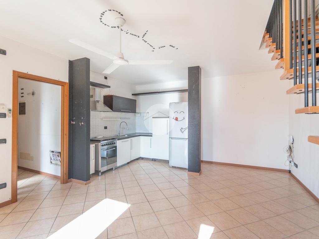 Piano primo: Luminosa zona giorno con angolo cottura che si affaccia su un balcone con vista panoramica. Allo stesso piano troviamo un antibagno e un bagno finestrato.