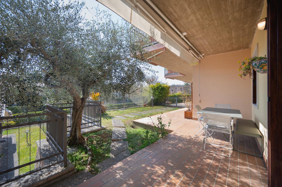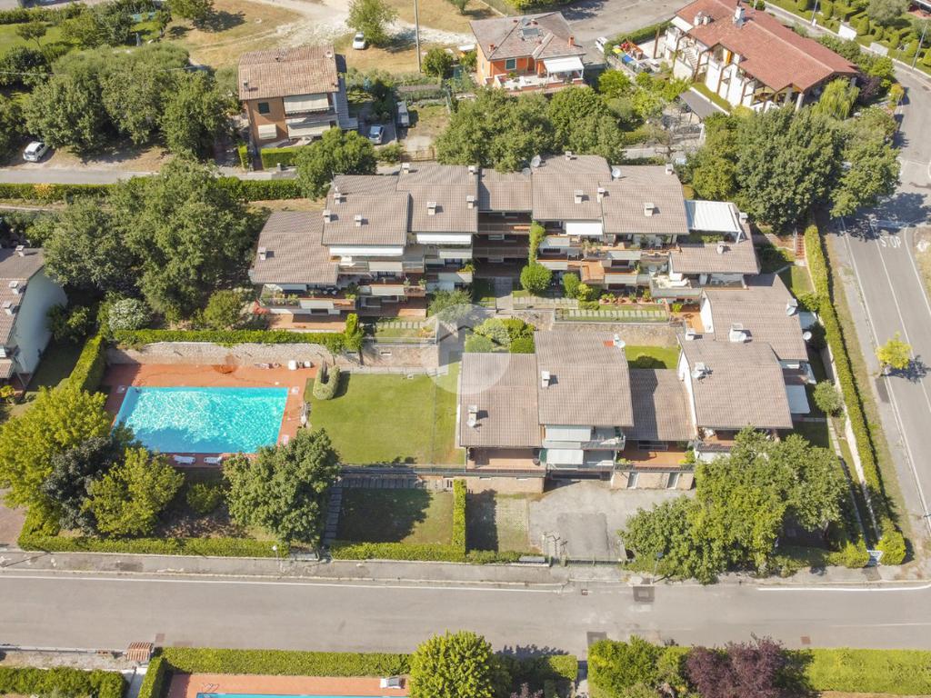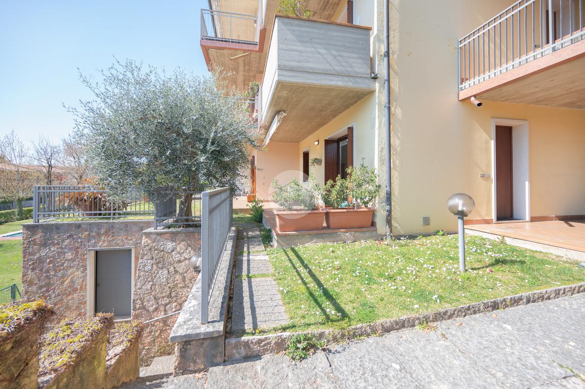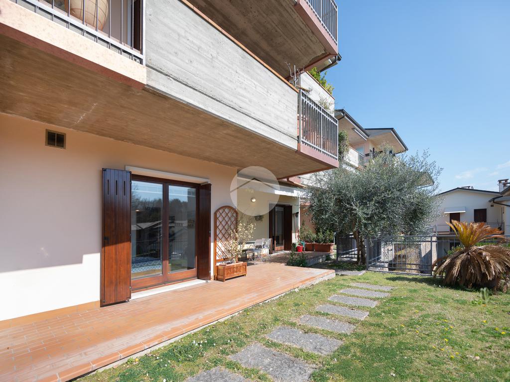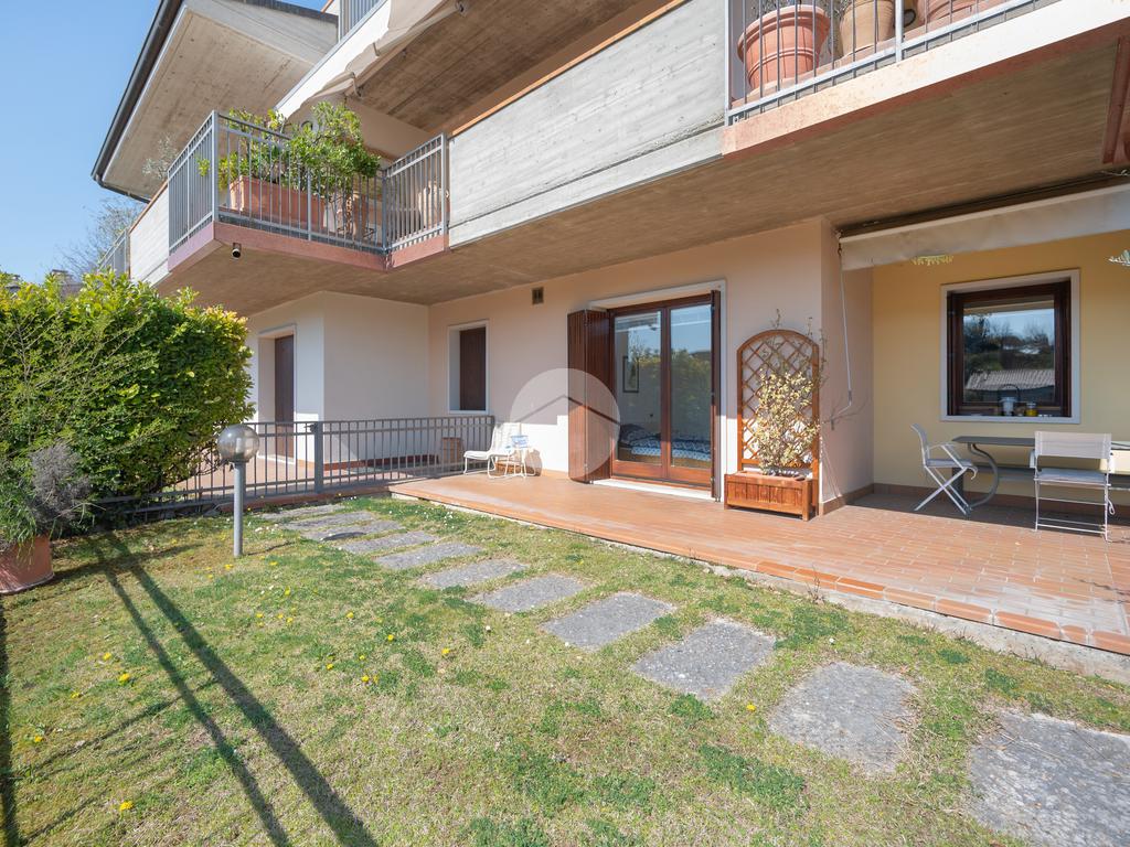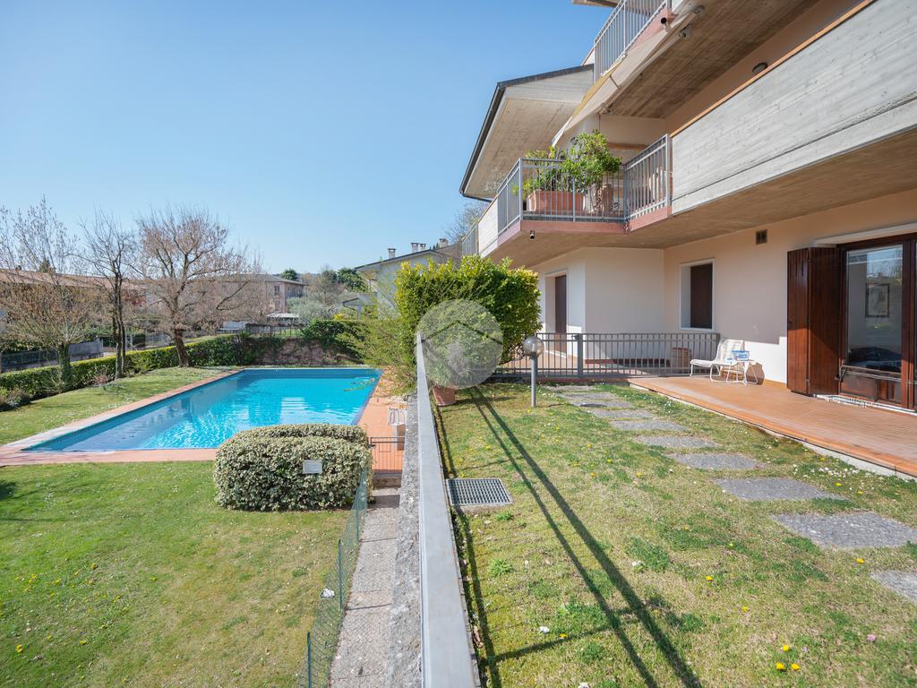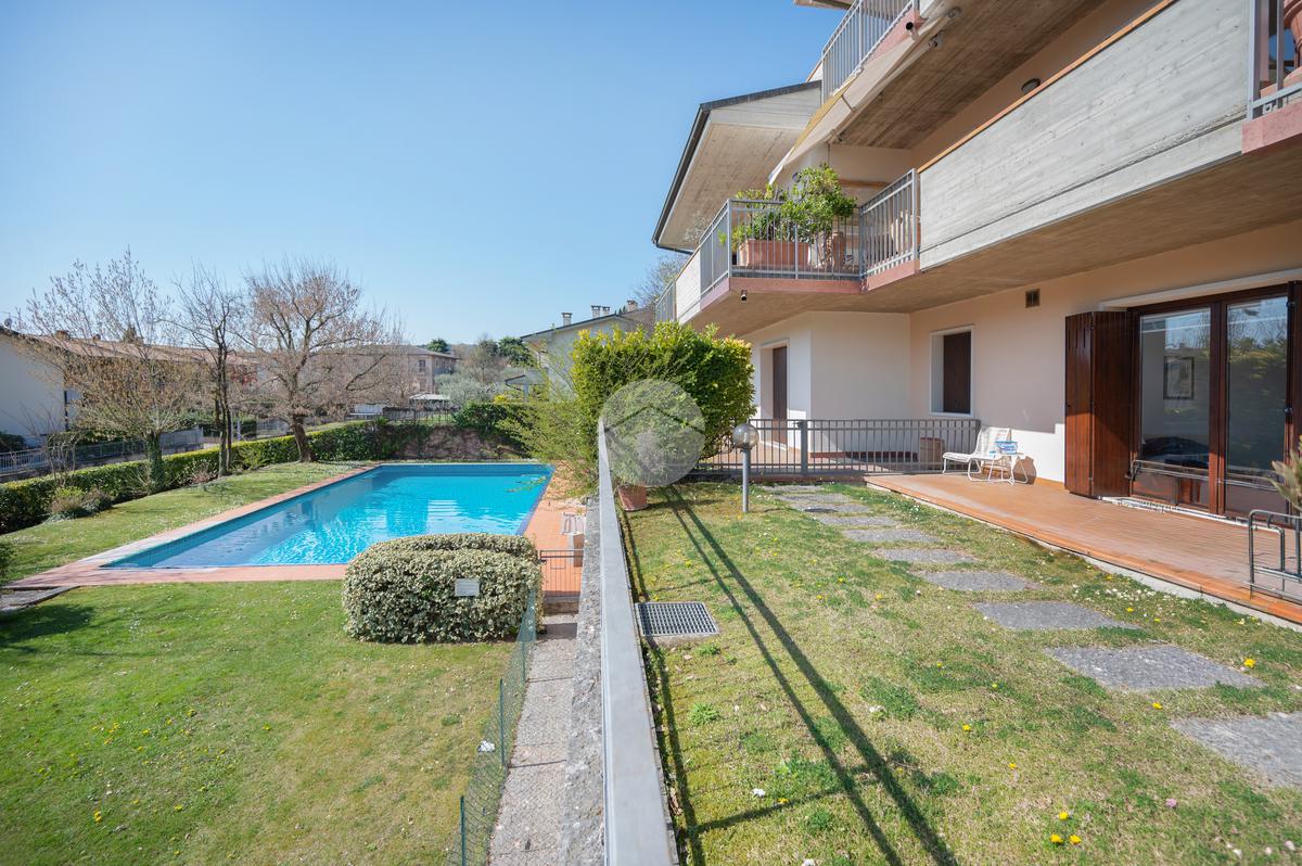 All'interno di un elegante residence con piscina, immerso nelle colline del lago e comodissimo ai campi da Golf, appartamento piano terra con porticato.
