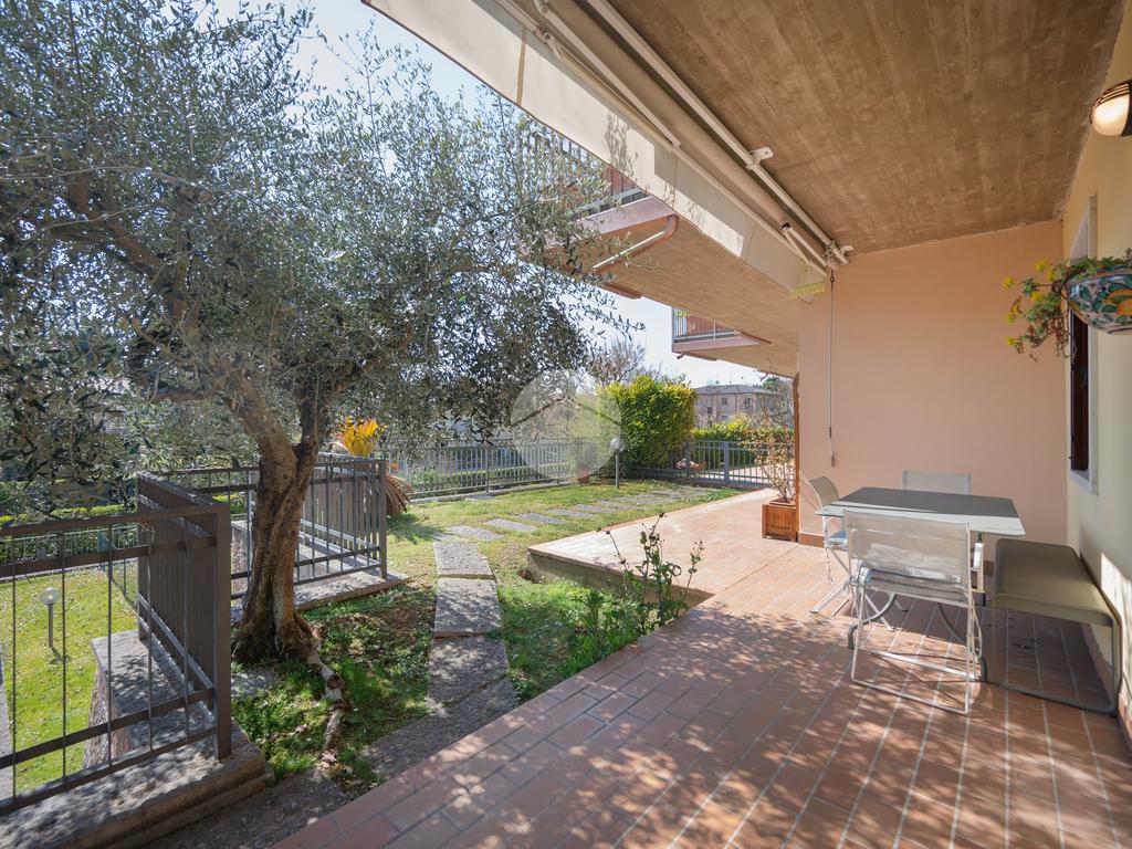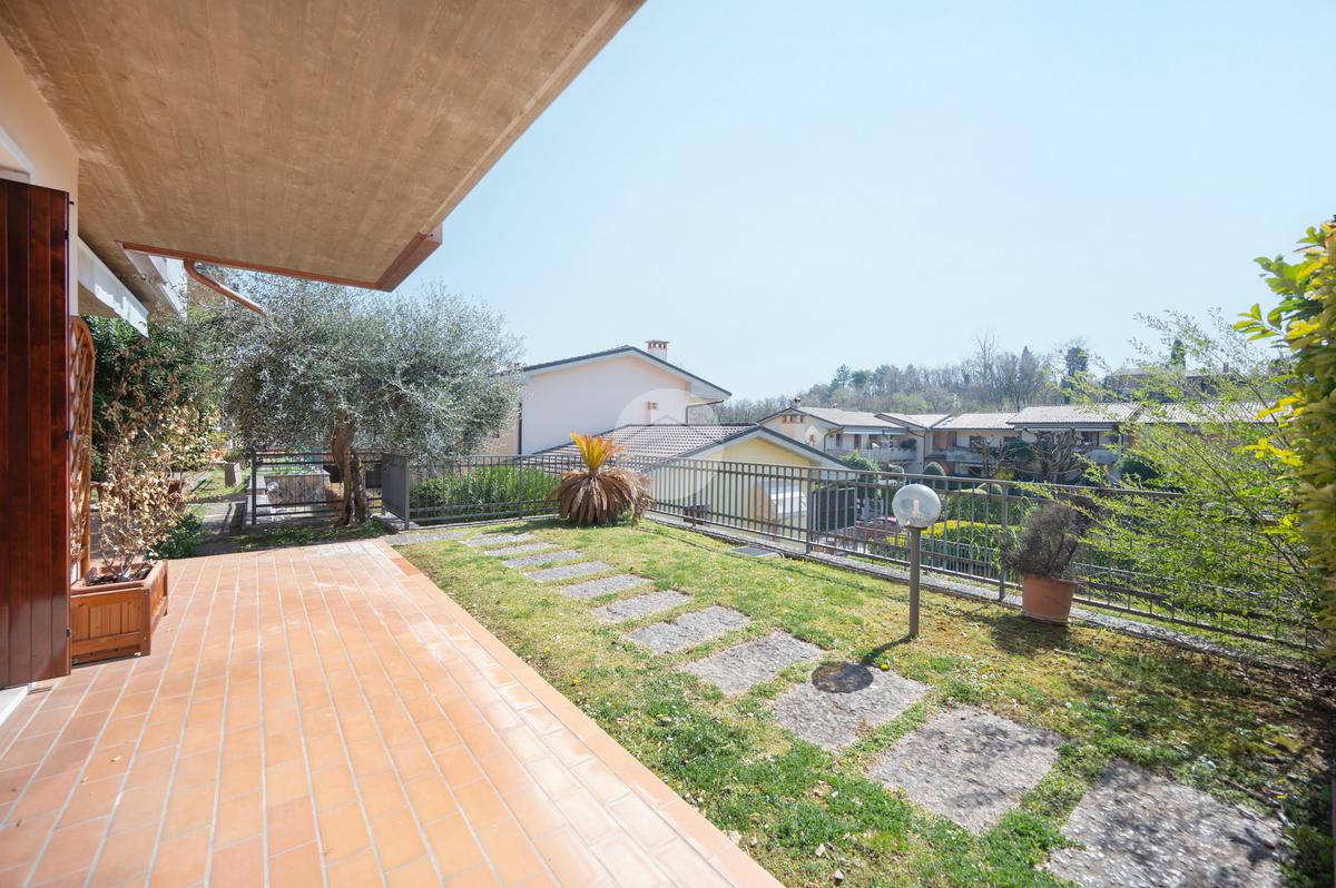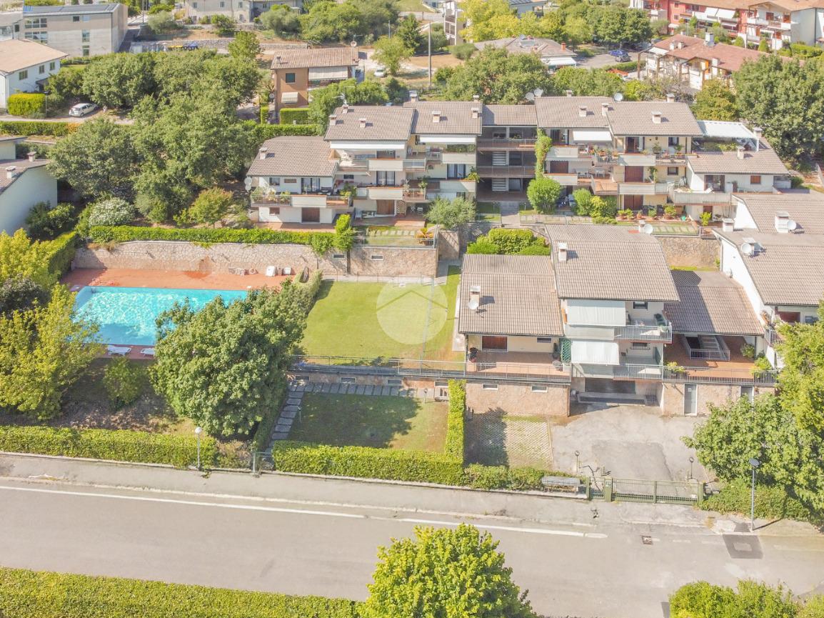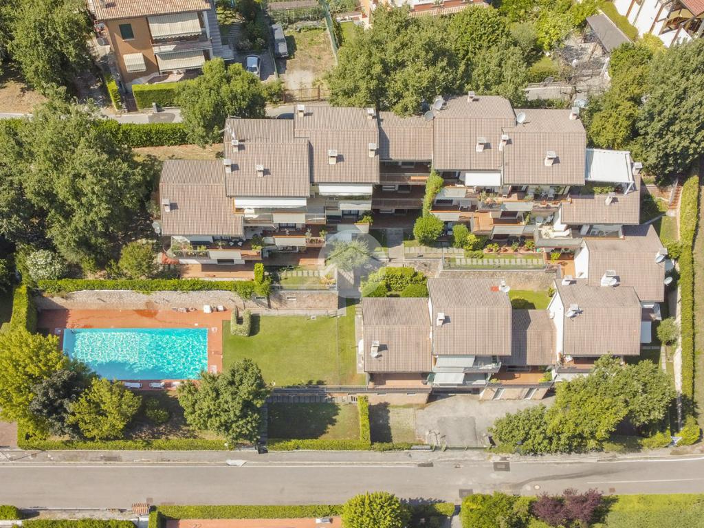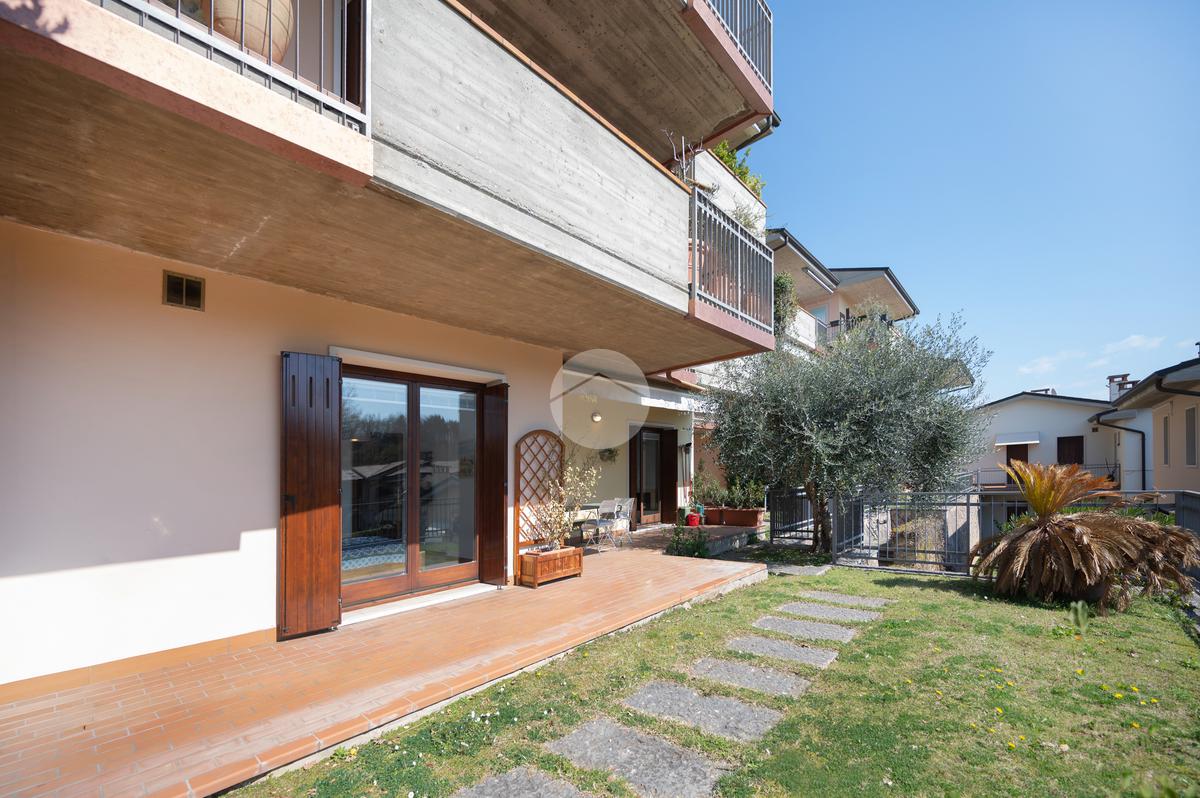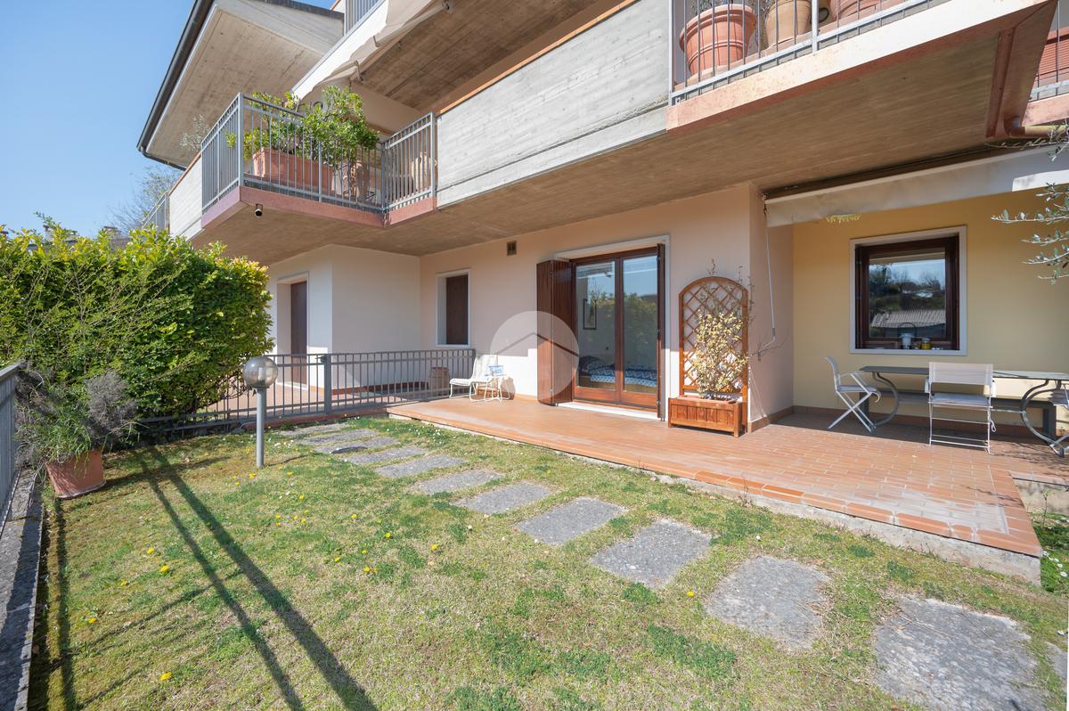 All'interno di un elegante residence con piscina, immerso nelle colline del lago e comodissimo ai campi da Golf, appartamento piano terra con porticato.