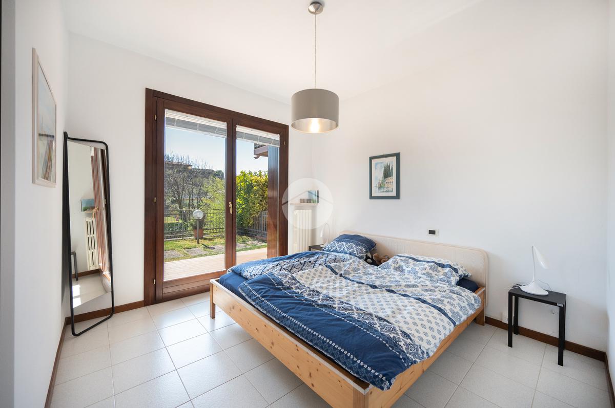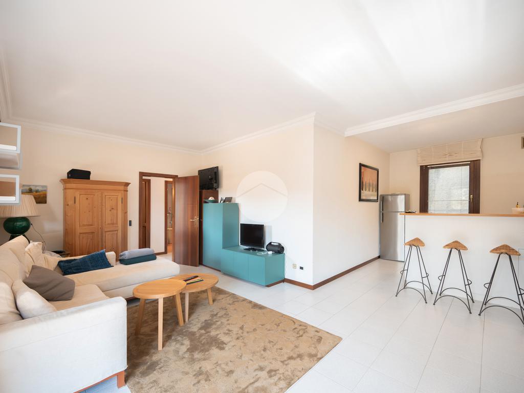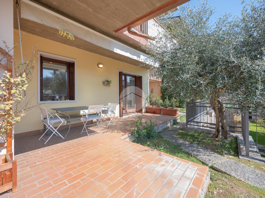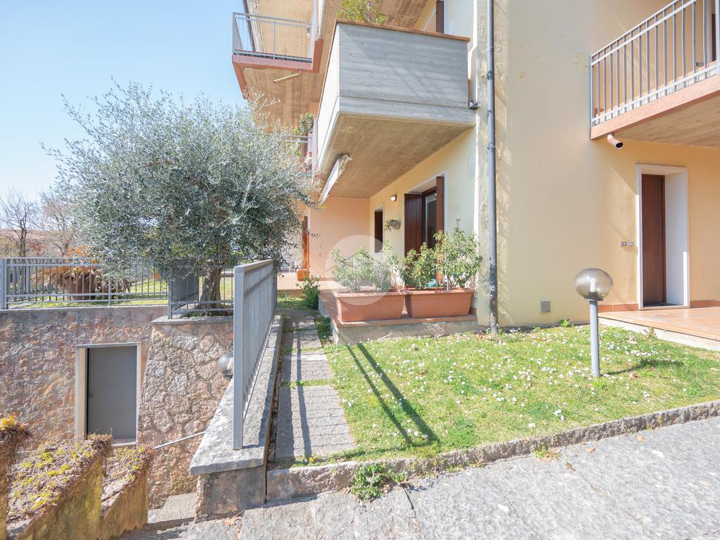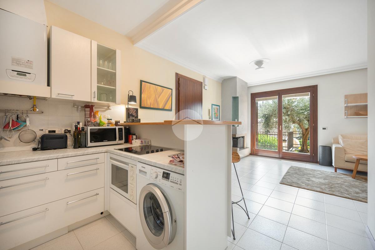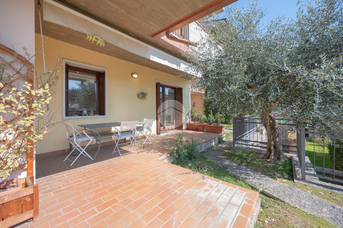 All'interno di un elegante residence con piscina, immerso nelle colline del lago e comodissimo ai campi da Golf, appartamento piano terra con porticato.